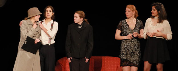 Jedes Stück beschäftigt sich auf seine eigene Art mit Zeit, mit Timing. In "The Mystery of Twicknam Vicarage" etwa wird die Zeit zurückgedreht. Die fünf Schauspielerinnen – auch die männlichen Rollen sind hier weiblich besetzt – bewegen sich rückwärts, der Tote steht auf, das komische Morddrama entfaltet sich neu.