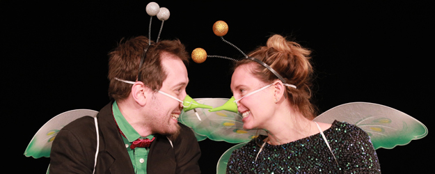 Abgestanden und alt allerdings wirkt hier nichts: Als nächstes proben Valeria Blinkin und Eric Hoenen. Sie spielen in "Time Flies" zwei turtelnde Eintagsfliegen. Der Text ist wortverspielt, die Romanze muss naturgemäß rasant verlaufen, auch wenn die beiden "Mayflies" noch keinen Schimmer von ihrem kurzen Leben haben. Als Fliegenrüssel halten grüne Trichter her, in Sachen Flügel hat die Truppe aufs übliche Fastnachtsangebot zurückgegriffen. Viel Geld ist nicht übrig für Kostüme oder Bühnenbild, aber das, was da ist an Ausstattung, funktioniert nicht nur, sondern wirkt hier und da sogar außerordentlich passend.