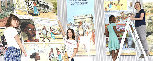 Zur Vernissage präsentierten die Studierenden eine szenische Lesung. Hier stellten sie "Aya" vor, eine Comic-Reihe von Marguerite Abouet von der Elfenbeinküste und Clément Ouberie aus Frankreich. Die beiden beschreiben das Leben junger Frauen in der westafrikanischen Millionenstadt Abidjan. Im Mittelpunkt steht die 18-jährige Aya, die witzig und frech aus ihrem Alltag erzählt. Sie steht kurz vor dem Abitur, genießt das Partyleben, ist manchmal genervt von den Jungs und schmiedet Pläne für die Zukunft.