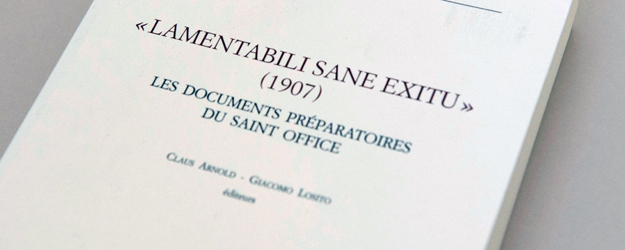 Doch erst einmal richtet er den Blick auf jene Modernismuskrise um 1900. Unter dem "Nötigsten", das er aus Frankfurt mitgebracht hat, findet sich ein dicker Band mit dem Titel "Lamentabili sane exitu (1907). Les documents préparatoires du Saint Office". Das Dekret "Lamentabili" der römischen Inquisition war gewissermaßen der Vorgänger der Enzyklika, mit der Papst Pius X. die Gruppe der Modernisten zugleich definierte und verdammte.